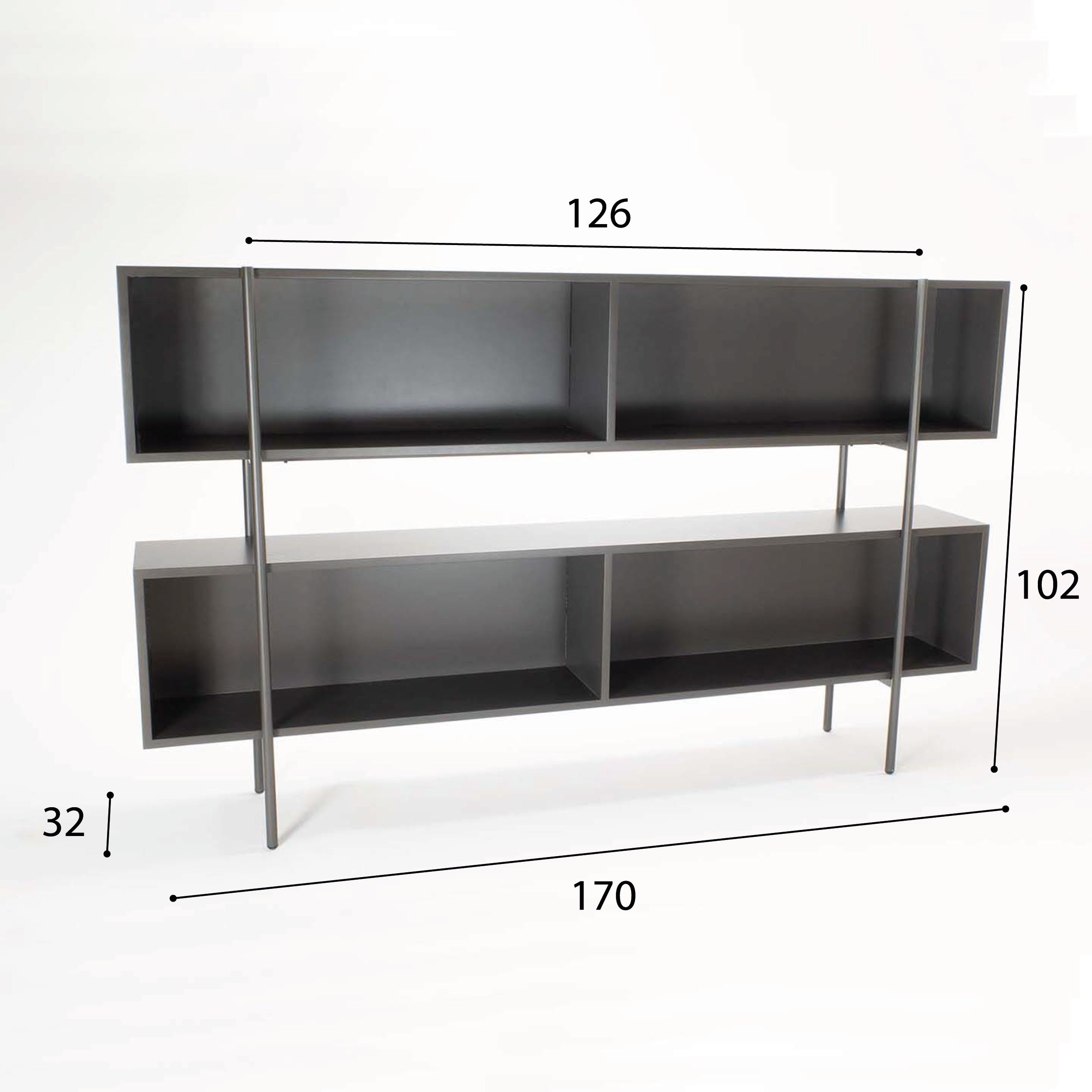 Estantería con estructura de metal y dos módulos en madera de roble o lacado mate. Ancho 170 cm.