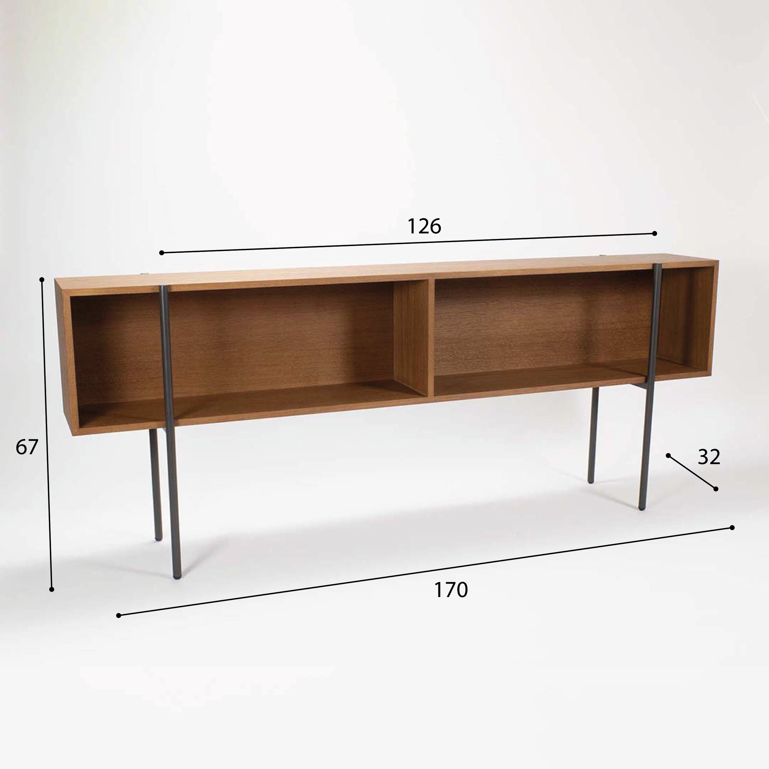 Estantería con estructura de metal y un módulo en madera de roble o lacado mate. Ancho 170 cm.